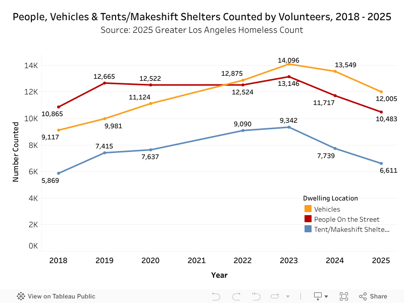 Note: Counts reflect the number of unsheltered adults (aged 25 and older) living on the streets and the number of vehicles, tents, and makeshift shelters counted, as recorded by volunteers, during the Los Angeles Continuum of Care Annual Homeless Count for each year.