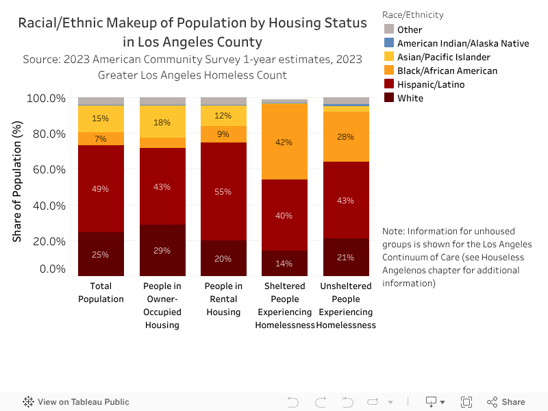 This dashboard provides a socioeconomic snapshot of Angelenos across housing types—homeowners, renters, and people experiencing homelessness, both sheltered and unsheltered. It highlights key differences by race and ethnicity, age, and income using the latest year of data available for each group. For a deeper look at how these populations have changed over time, see the dedicated chapters on homeowners, renters, and houseless Angelenos.